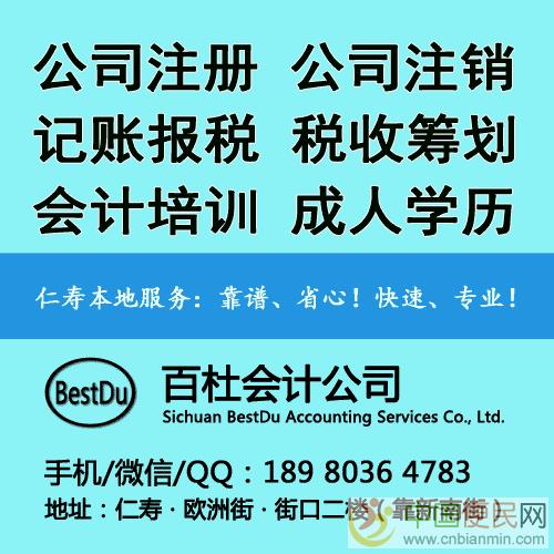 仁寿县百杜会计公司,一家专业的会计公司,仁寿本地服务,在业界以专业,省心,高效率获得客户一致好评,是仁寿当地会计公司中的佼佼者。www.cnbianmin.com中国便民网